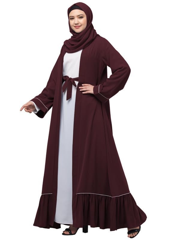 Dual Layer Abaya Dress Of Inner Abaya And Detachable Shrug With Piping And Frill Work(Burgundy)