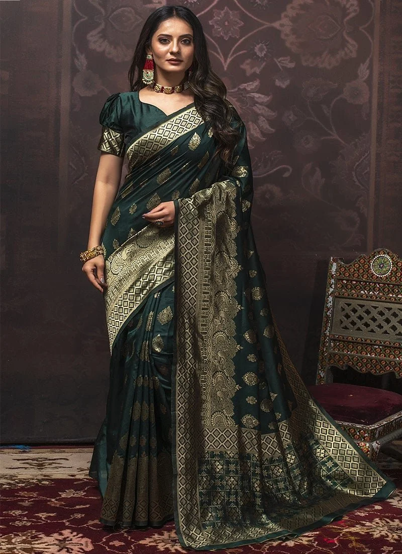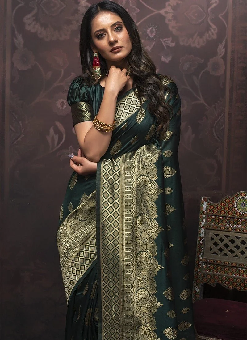 Fashion and pattern would be at the peak in this green Benarasi silk saree. The ethnic jacquard work over the saree with different temple motifs looks chic and ideal. This saree comes with a green Benarasi silk blouse. This saree is perfect for a festival.