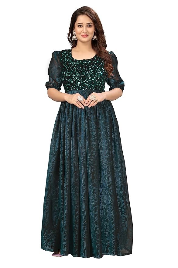 Green Elegant Women’s Long Gown | Anarkali Style | Flared Floor-Length Dress | Floral Emboss Print | Sequence Embroidery