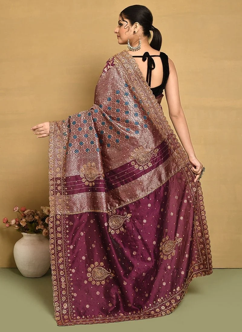 - This exquisite winecolored Kancheepuram silk saree is a perfect blend of tradition and artistry showcasing the finest handembroidered craftsmanship. The saree is made from pure Kancheepuram silk renowned for its lustrous sheen and durable quality. The rich wine hue adds a touch of elegance making it ideal for grand occasions like weddings festivals or special celebrations. The entire saree is adorned with intricate handembroidered patterns showcasing floral motifs and traditional Indian designs creating a luxurious and regal appearance. The craftsmanship on the saree speaks volumes about the skill and dedication of the artisans who have meticulously worked on it making each stitch a piece of art. The embroidery adds depth and texture to the fabric enhancing its overall beauty and making it a showstopper wherever it is worn.