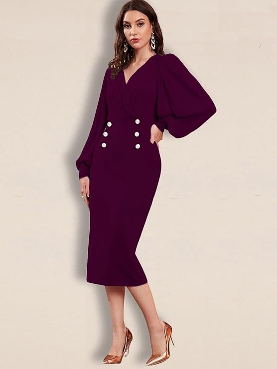 Women Bodycon Sweatheart Neck Lantern Sleeve one Piece Bodycon Midi Dress | Dress for Women (Wine)