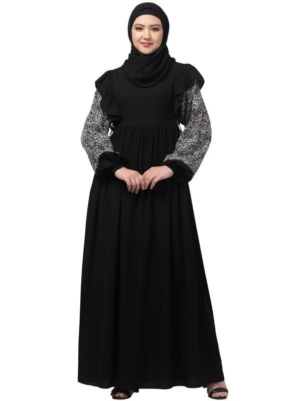 Women’s Dual Fabric Maxi Dress With Frill On Shoulders and Elastic Sleeves – Made with Printed Crepe And Nida Matte Fabric