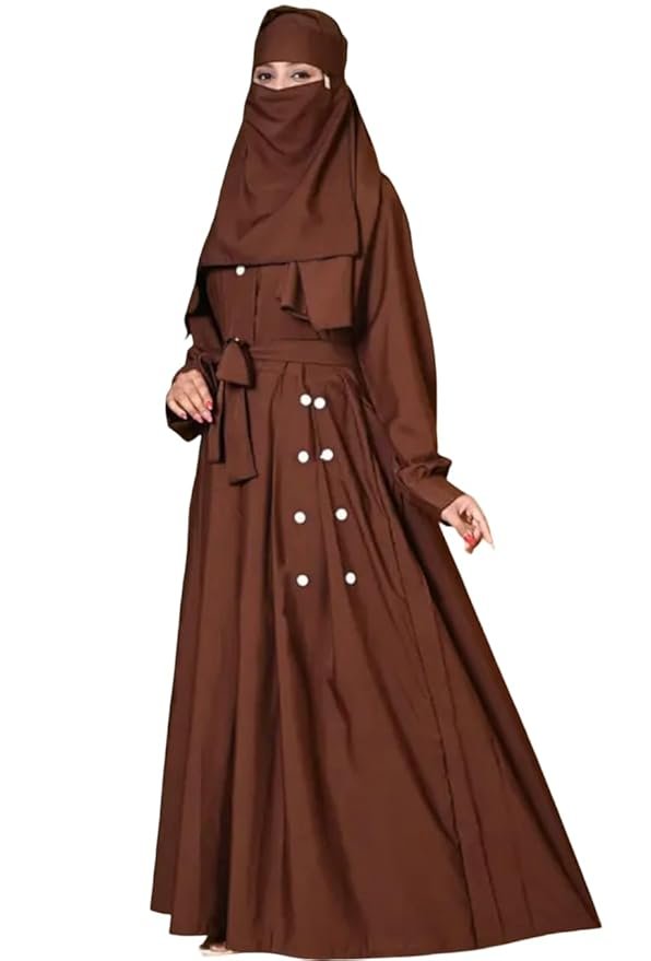 Women’s Elegant Abaya Set with Button Details, Full Length Islamic Dress, Long Sleeve Maxi Dress with Niqab, Traditional Muslim Prayer Wear(Brown)