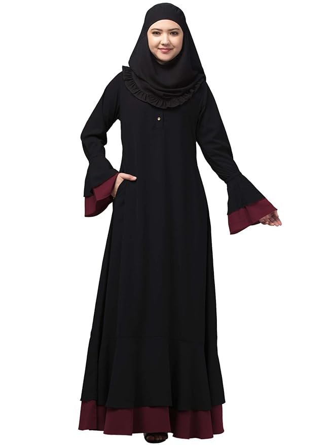 Women’s Maxi Dress With Bell Sleeves and Elasticated Sleeves – Made with Nida Matte Fabric(Black Maroon)