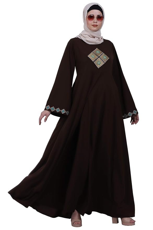 Women’s Nida Matte Umbrella Abaya Dress with Embroidery, Long Sleeves & Side Pocket(Coffee Brown)