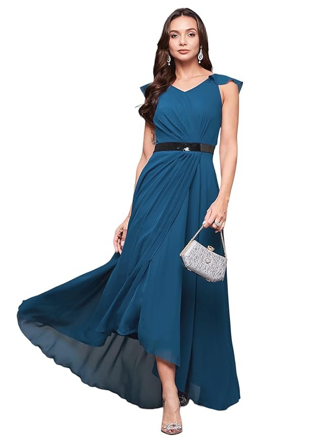 Women’s Powder Blue V-Neck Ruffled Sleeve Solid Embellished Maxi Dress(Royal Blue)