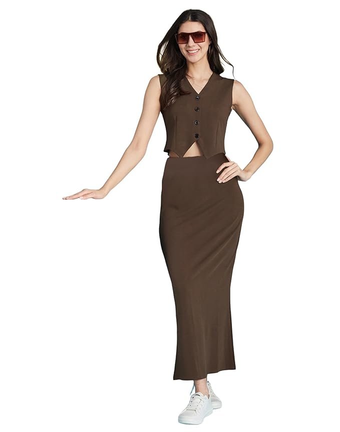 Women’s Tops and Skirt Coord Set, Lycra Dress for Woman Stylish(Brown)